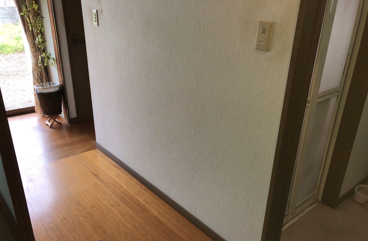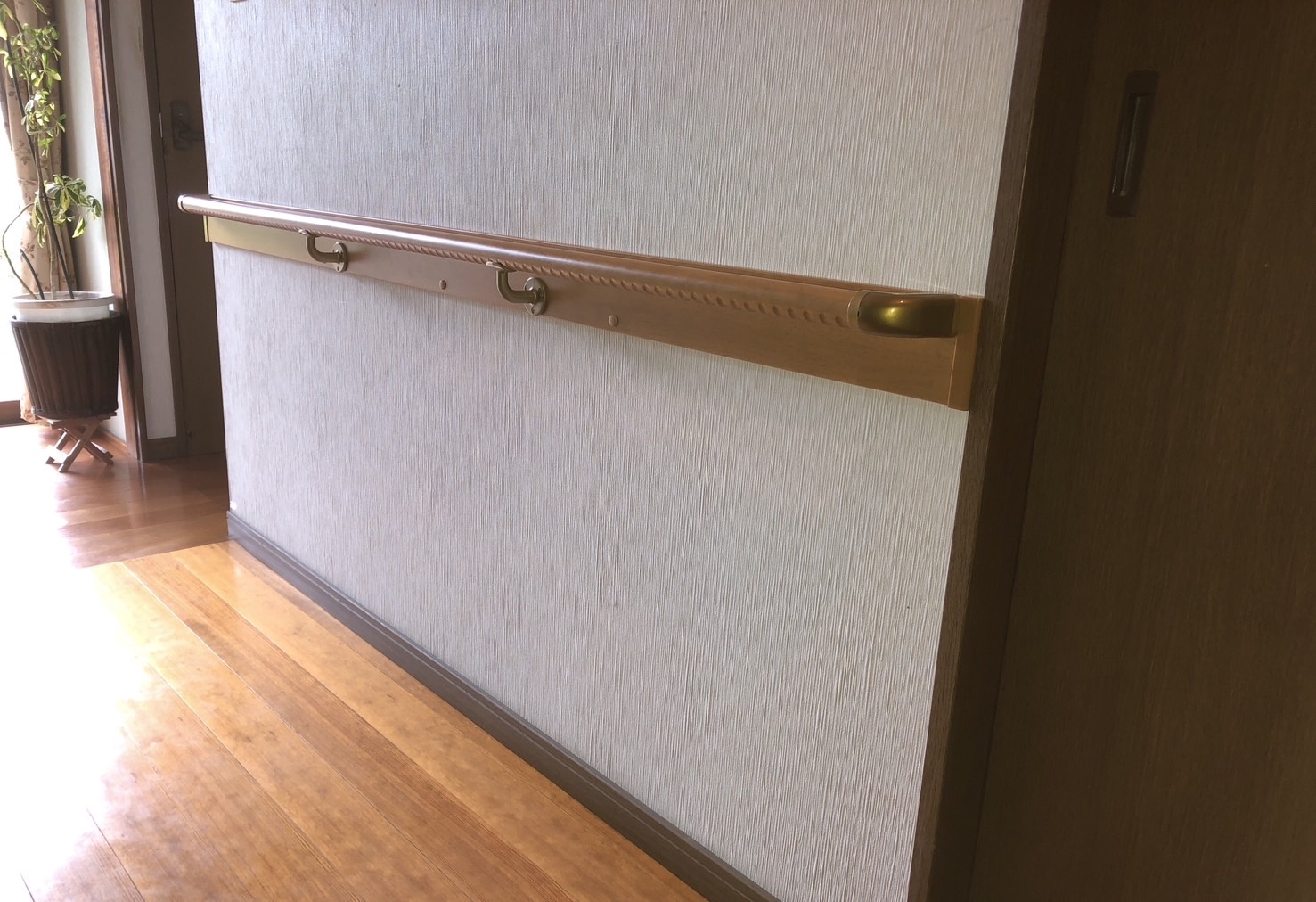 洗面所・お風呂へ続く廊下の壁面に手すりを設置。滑りやすい廊下での転倒を防げるようになりました。